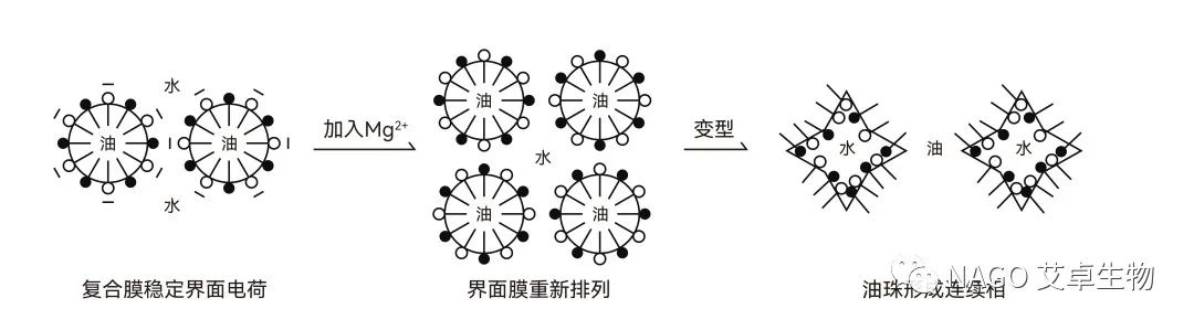 分散相的微球狀液滴直徑一般在0.05~10μm之間時(shí),微小液球會(huì)相互聚集,力圖縮小界面積,降低界面能,分散的微小液球逐漸合并,液滴逐漸變大,最后使油和水重新分開成為兩層液體,油和水又恢復(fù)到原來狀態(tài)。如圖1